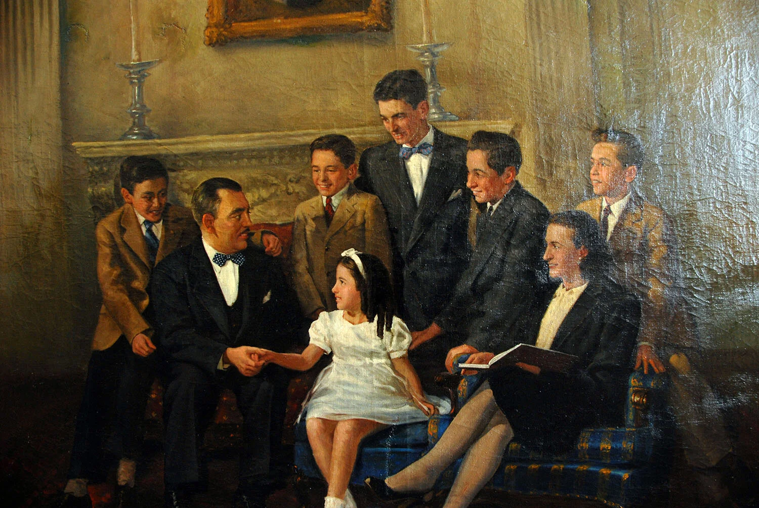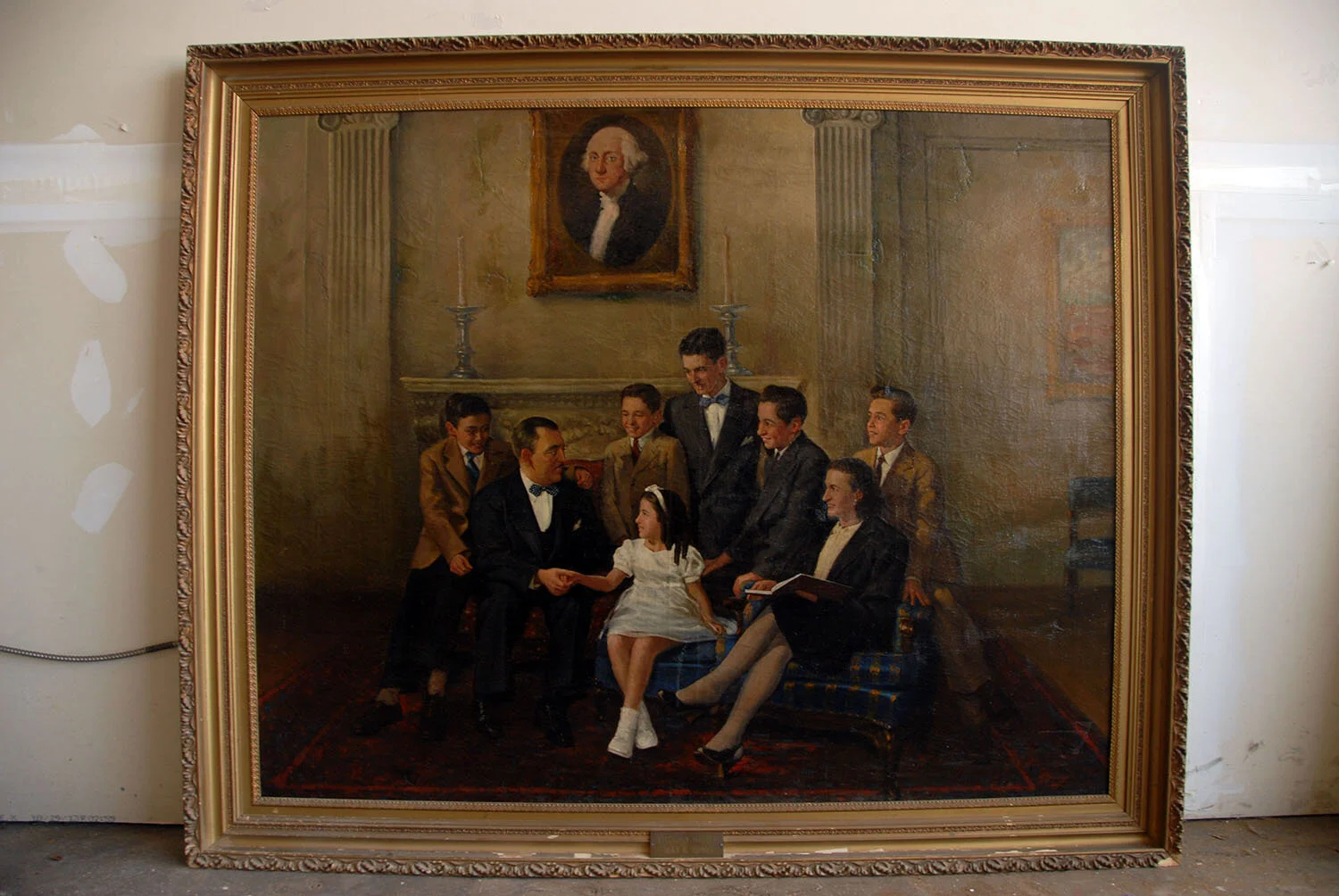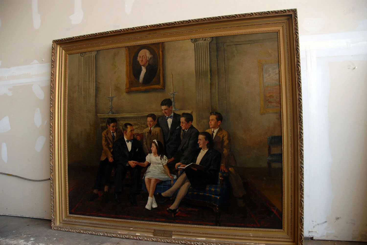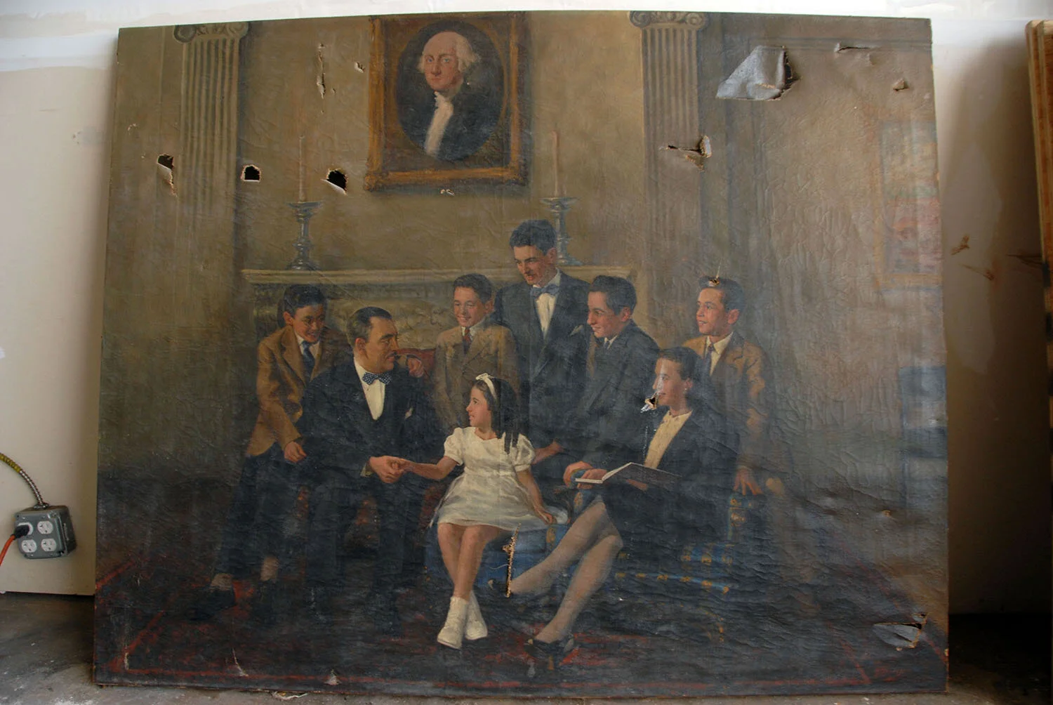 Murals of Baltimore and Mr. Michael Kirby was contracted to restore the family portrait of a young Nancy Pelosi and D’Alesandro Family by Harvey Brownson. The painting was left on the streets after construction workers were restoring the family home in Baltimore. The painting had over 25 holes and various scratches on the surface. The wood frame was rotting out. Murals of Baltimore did a full restoration of the portrait painting and restoring the painting to its original look.